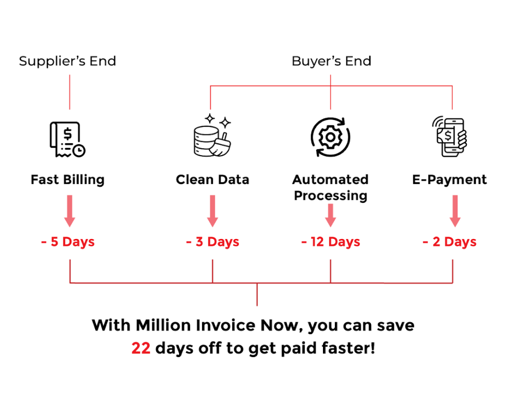 For a typical 60-day term invoice processed through the traditional method (excluding financing or factoring), Million InvoiceNow significantly reduces processing time, providing substantial time savings.